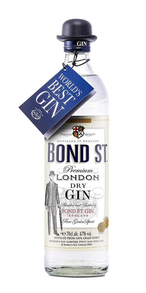Il nome originale di questo distillato è Broker’s Gin, ma per motivi di copyright in Italia ha dovuto cambiare il nome con Bond St. Gin. Il prodotto è esattamente lo stesso, solamente il nome è diverso. Si dice che la ricetta del pluripremiato Broker’s Gin risalga a 200 anni fa. L’illustrazione sulla bottiglia raffigura un “broker”, il tipico operatore finanziario londinese, mentre il tappo stesso è ispirato al Bowler Hat o “bombetta”, il classico cappello del broker. Broker’s Gin è tra i pochissimi con certificato kosher. Si tratta di un classico London Dry dalla quintuplice distillazione, molto secco, con predominanti note del ginepro, bilanciate dalle note rinfrescanti degli agrumi e, nel finale, da quelle speziate.